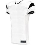 100% polyester heavyweight tricot mesh body * 90% polyester/10% spandex 2-ply yoke, sleeves and side inserts * Updated fit to accommodate traditional and slimmer pads * Outside locker label * V-neck collar with center front insert * Contrast color cap sleeves with contrast color half-elastic cuffs for secure fit over pads
